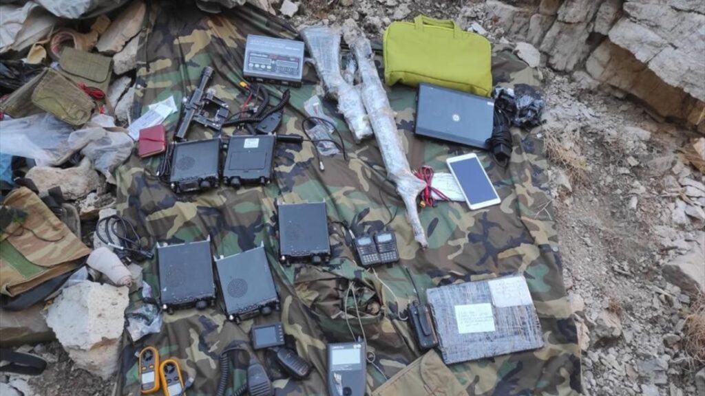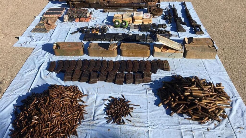 Yapılan aramalarda, uçaksavar silahı, dragunov keskin nişancı tüfeği, M-4 piyade tüfeği, uçaksavar silahı sehpası, dragunov keskin nişancı tüfeği dürbünü, 2 makinalı tüfek namlusu, 4 havan mühimmatı, 2 RPG-7 sevk fişeği, 7 bin muhtelif çapta mühimmat, 71 el bombası,14 anti-tank mayını, 40 el bombası tapası, 39 muhtelif çapta silah şarjörü, 3 bin biksi mayonu, 200 havan sevk barutu, 6 araç telsizi, 3 el telsizi, 6 EYP, 3 kilogram C4 patlayıcı, 9 EYP basma düzeneği, 44 EYP ateşleme sistemi, bir EYP ateşleme sistemi kumandası, 41 elektronik devre, 6`lı pil bloğu, 170 metre kablo, 5 metre infilaklı fitil, 6 akü, bir güneş paneli, 2 rüzgar ölçer, 32 tüp, 750 kilogram gıda maddesi, 350 yaşam malzemesi ve muhtelif miktarda sağlık malzemesi ele geçirildi.