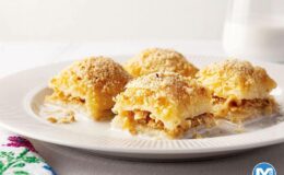 - Dolaptan hamuru çıkarın ve elmalı karışımı eşit biçimde tabana yayın.Bir tencereye süt ve pudingleri alın. Orta hararetli ateşte sürekli karıştırarak göz göz oluncaya kadar muhallebi kıvamında pişirin.