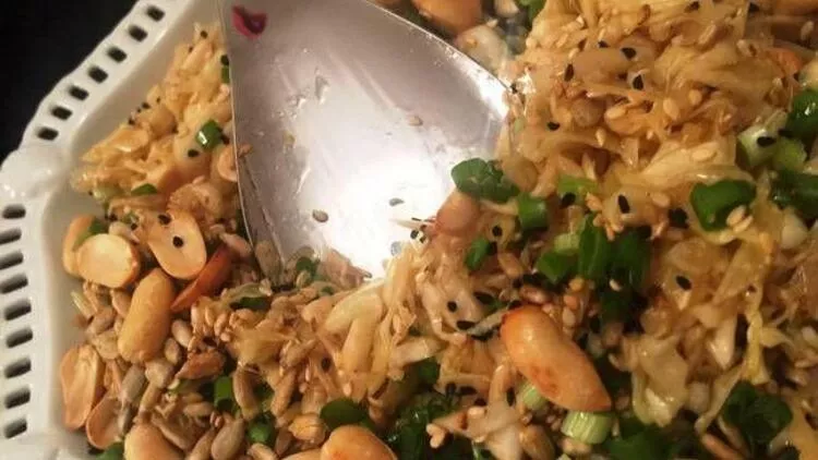 Lahana ve taze soğanı ince ince doğrayın. Portakalın kabuğunu rendeleyin. Lahana ve portakal kabuğu rendesini karıştırın. Soya sosunu, şekeri, zeytinyağı ve sirkeyi bir kasede birleştirin, iyice karıştırın ve geniş bir kaseye koyduğunuz lahananın üzerine dökün. 3-4 saat üzeri kapalı olarak bekletin. Lahana bu şekilde marine olup yumuşar. Kabak çekirdeği ya da günebakanların içini, susamı ve yer fıstığını yağsız tavada ayrı ayrı kavurun. Servis tabağına alınan lahananın üzerine önce yeşil soğan daha sonra susam, çekirdek ve en son fıstıklarını koyun. Hemen servise sunun. Arzuya göre çörek otu da serpilebilir.