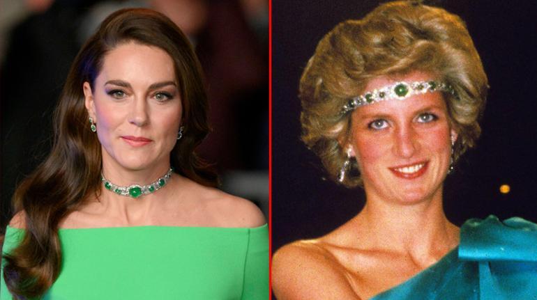 İlk bakışta elbisenin modeli gayet sade, fiyatı da uygun ve gecenin ana temasına uygun görünse de Kate’in üzerinde değeri milyonlarca dolarla ölçülen göz alıcı bir takı vardı. Geçmişte William’ın annesi Diana’nın, hem kolye hem de saç bandı olarak kullandığı yeşil gerdanlık. Art deko tarzındaki bu gerdanlığın değerinin 15 milyon dolar olduğu belirtiliyor. Bu gösterişli gerdanlığın 2. Elizabeth’e büyükannesi Kraliçe Mary’den miras kaldığını da ekleyelim.
