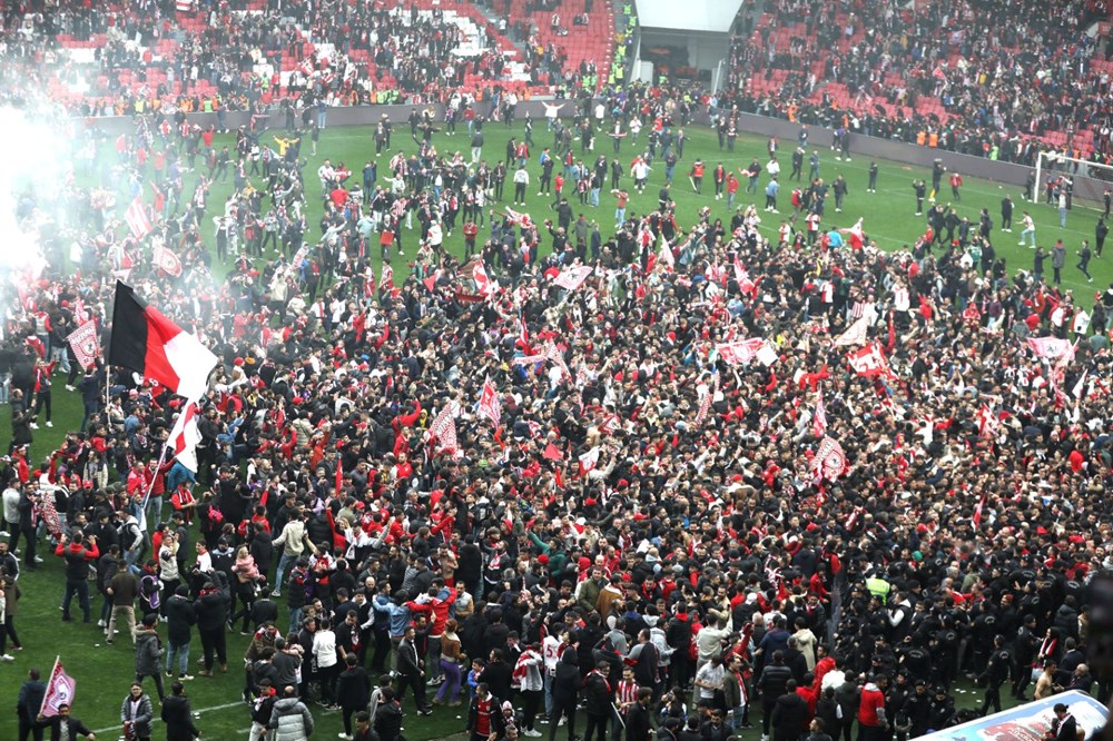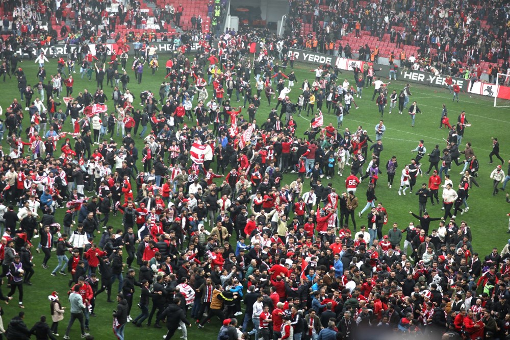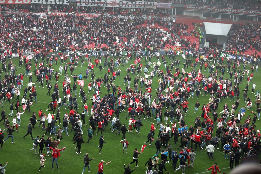 Taraftarların sahadan çıkarılmasının ardından karşılaşma kaldığı yerden devam etti. Mücadelenin bitmesiyle binlerce taraftar sahaya akın etti.