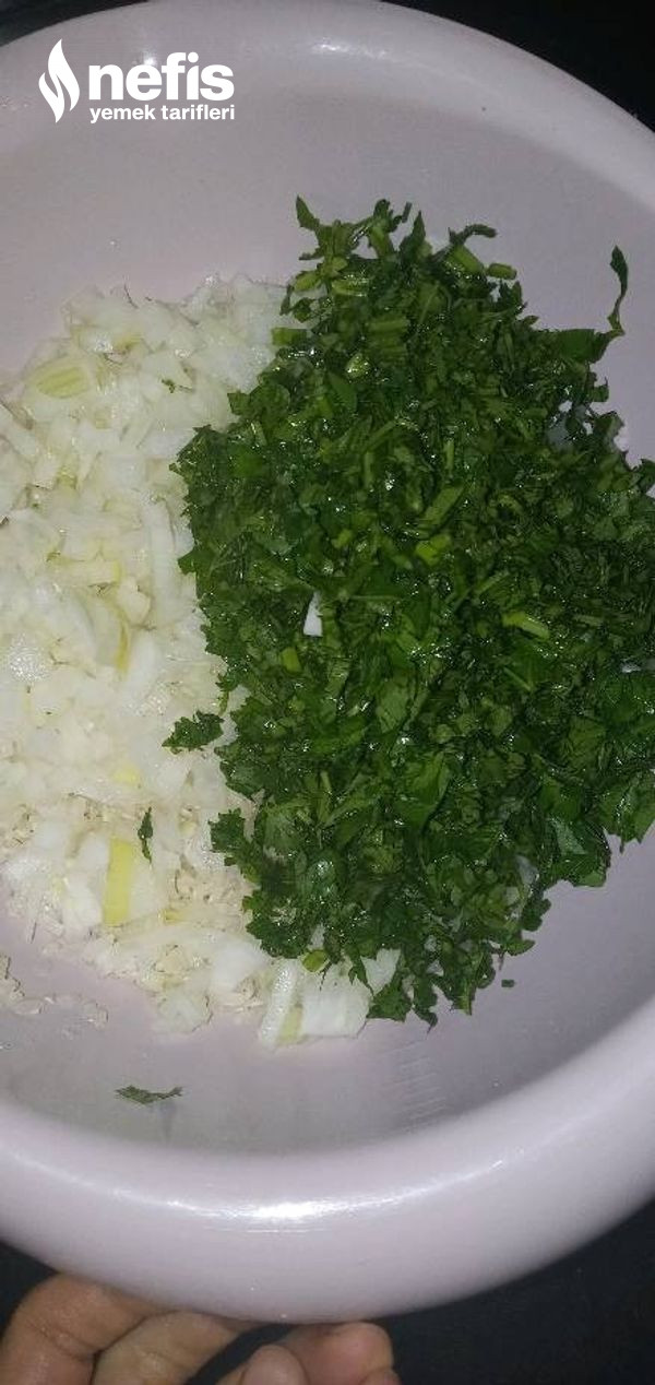 - Üzerine ince ince doğradığımız soğan,domates ve maydanozu ekliyoruz.